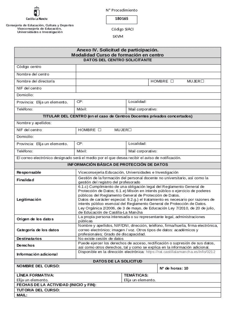 La Solicitud de Curso de Formación Educativa de Castilla-La Mancha es un formulario utilizado por centros educativos para solicitar cursos de formación en la región de Castilla-La Mancha, España.