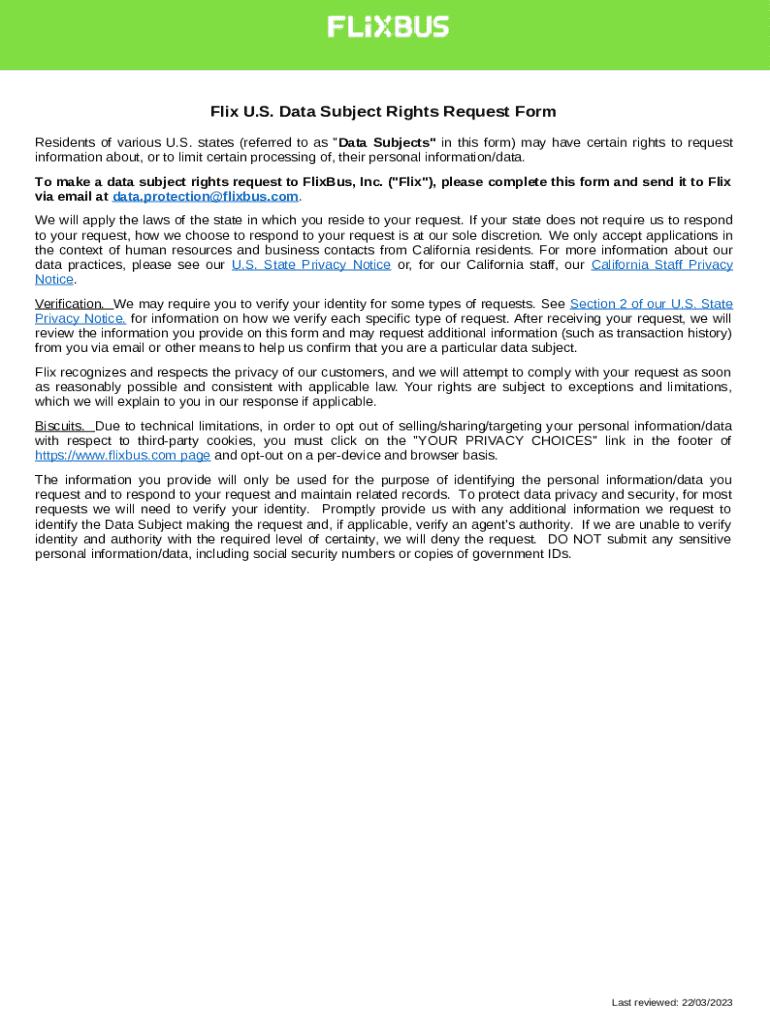 The Flix U.S. Data Subject Rights Request Form is primarily intended for California residents due to specific state privacy laws. Individuals who believe their personal data is processed by FlixBus may need this form if they wish to: