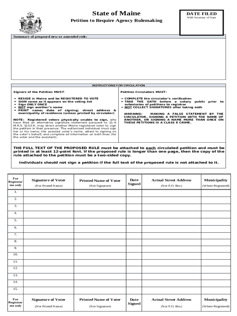 To sign or circulate the petition, individuals must be registered voters and residents of Maine. It is essential to be aware of these requirements to ensure the legitimacy of the petitioning process.