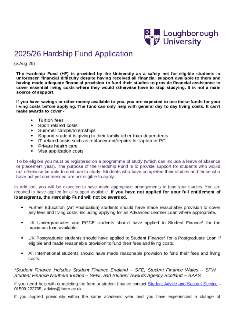The 2025/26 Hardship Fund Application is designed for students facing unexpected financial challenges. This application serves as a vital financial aid resource that contributes to essential living costs for those who have exhausted other forms of support. It is crucial for applicants to understand the eligibility criteria associated with this fund, ensuring that help is directed to students in genuine need.