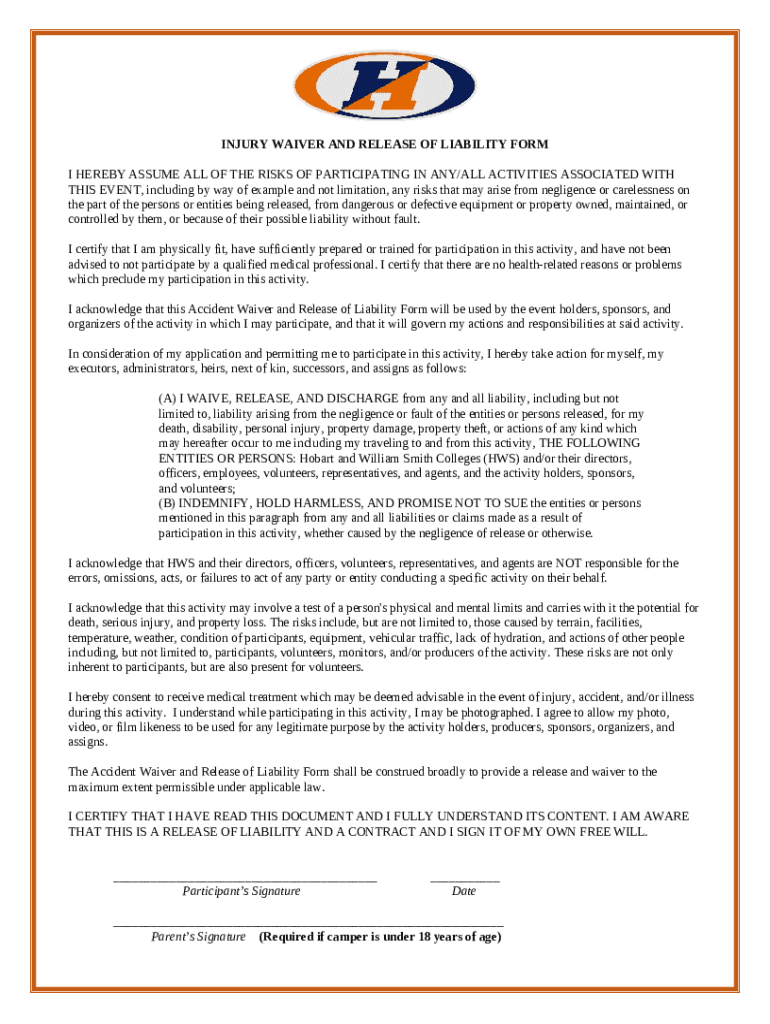 The Injury Waiver and Release of Liability Form is a legal document used by participants in activities organized by Hobart and William Smith Colleges to waive liability for any injuries or damages during the activity.