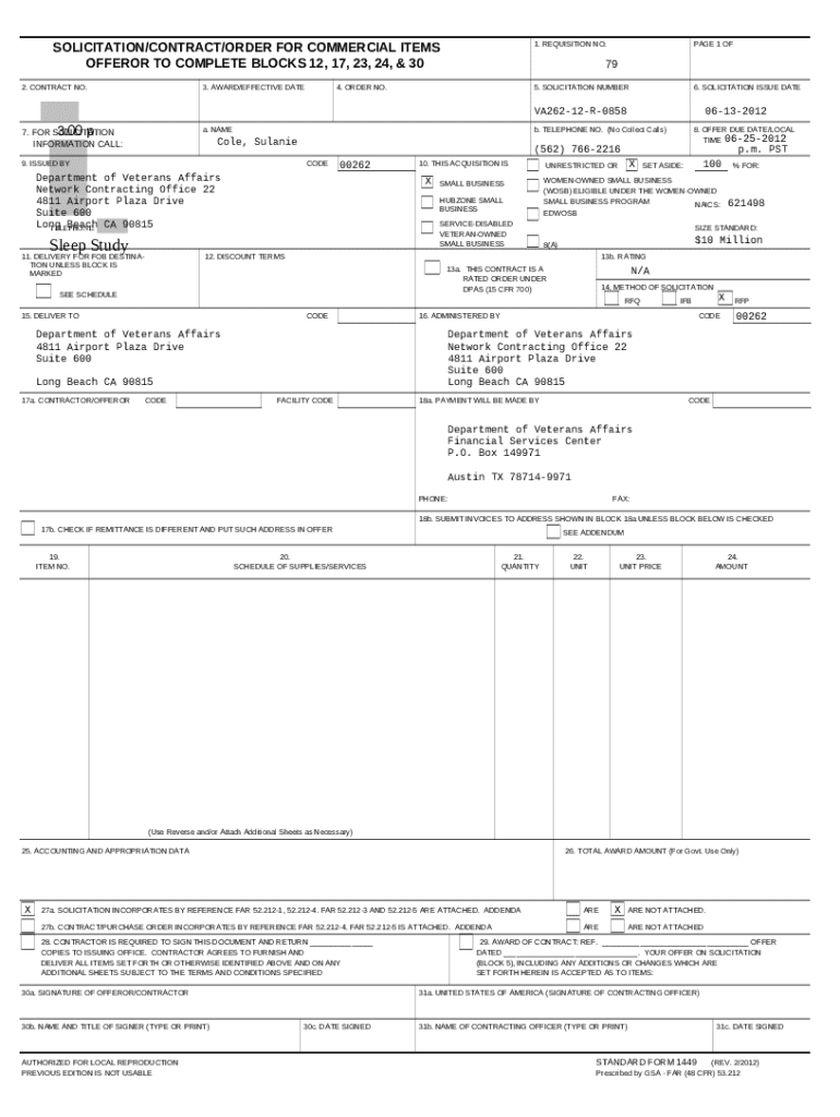 The US Federal Commercial Item Solicitation Form is a government document used by the Department of Veterans Affairs to procure commercial items through contracting proposals.