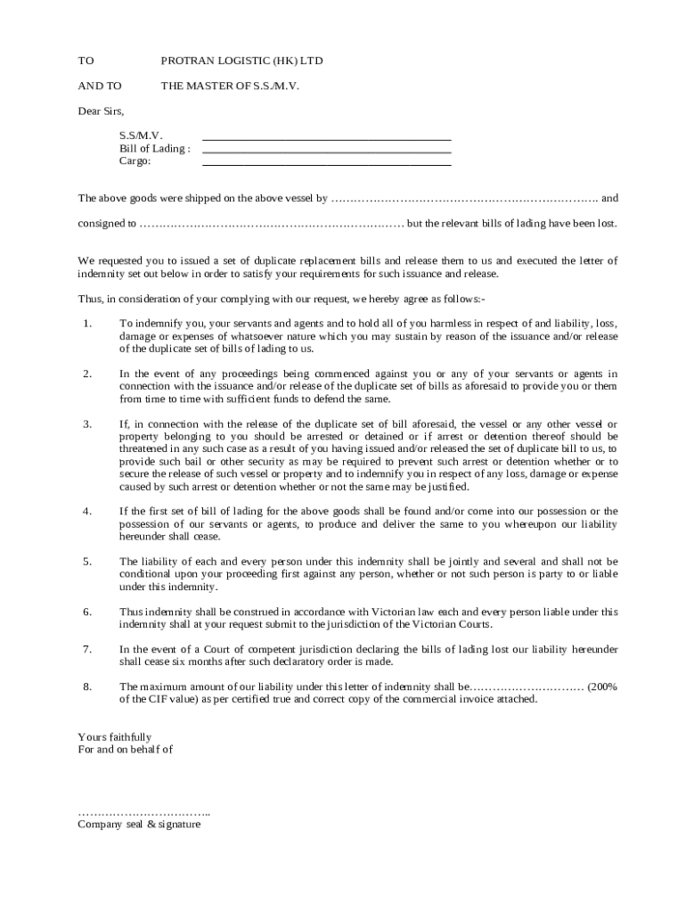 Get the free Letter of Indemnity for Lost Bill of Lading