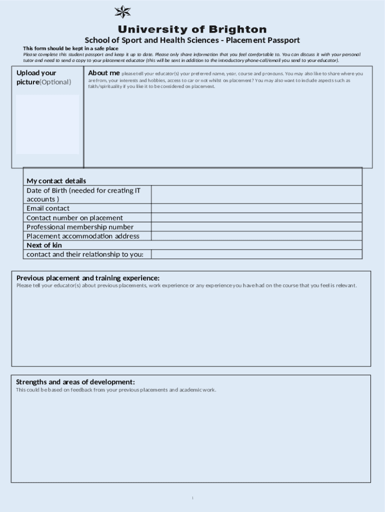 The Student Placement Passport is an essential education placement document utilized by students in the School of Sport and Health Sciences. Its primary purpose is to collect and present personal and professional information that aids placement educators in supporting students effectively during their practical training experiences. Key components of the form include sections for contact details, previous experiences, and essential health information.
