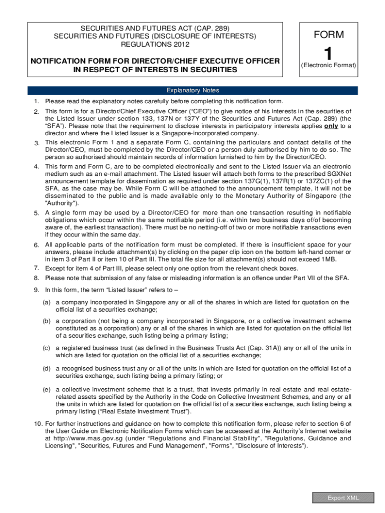 The completed Singapore Securities and Futures Disclosure Form should be submitted electronically to the Listed Issuer, who will ensure dissemination via SGXNet.