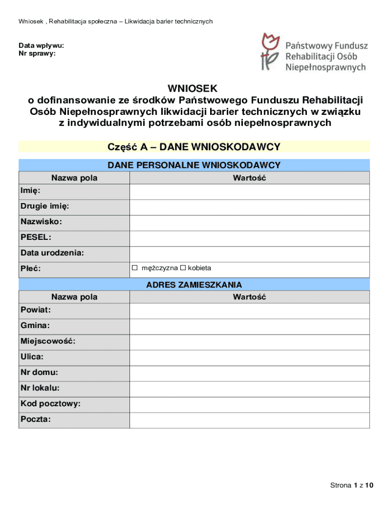 The Application for Technical Barrier Removal Funding is a government form used by individuals seeking financial support to eliminate technical barriers for disabled persons in Poland.