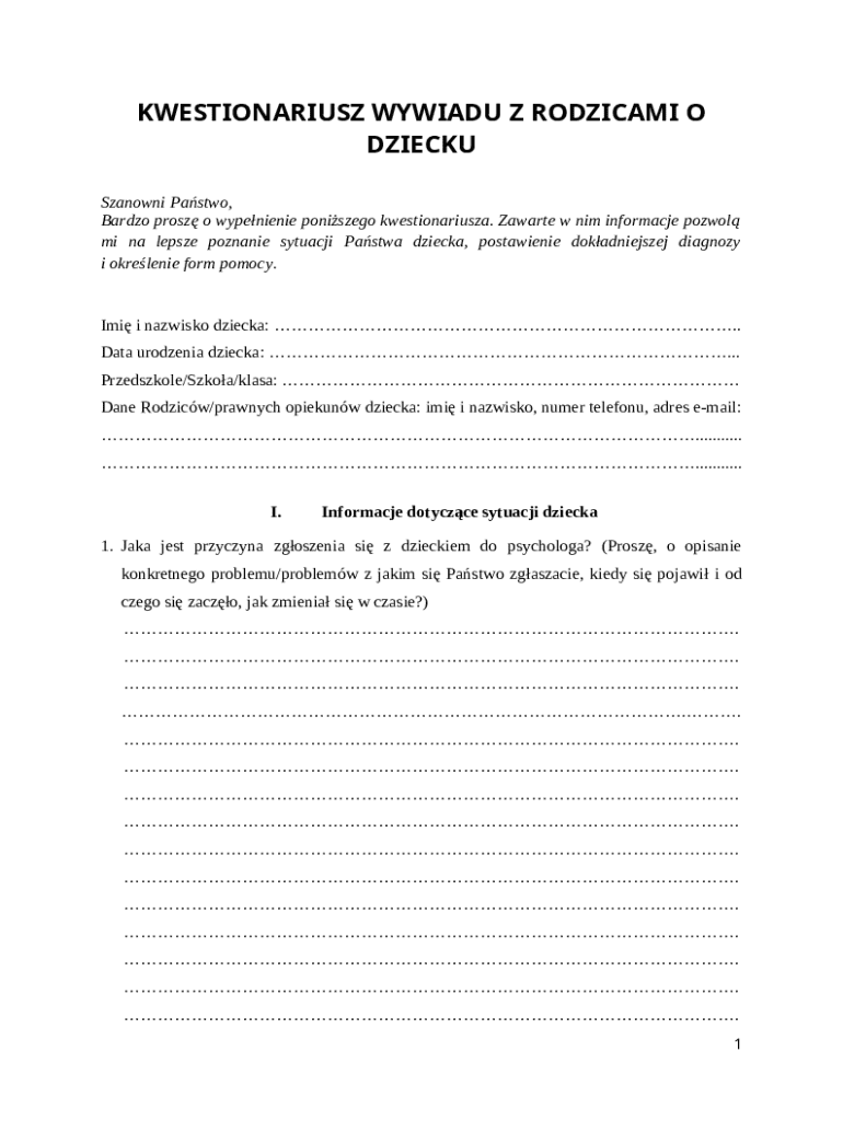 The Child Psychology Questionnaire for Parents is a healthcare form used by psychologists to gather essential information about a child's situation, diagnosis, and required support.