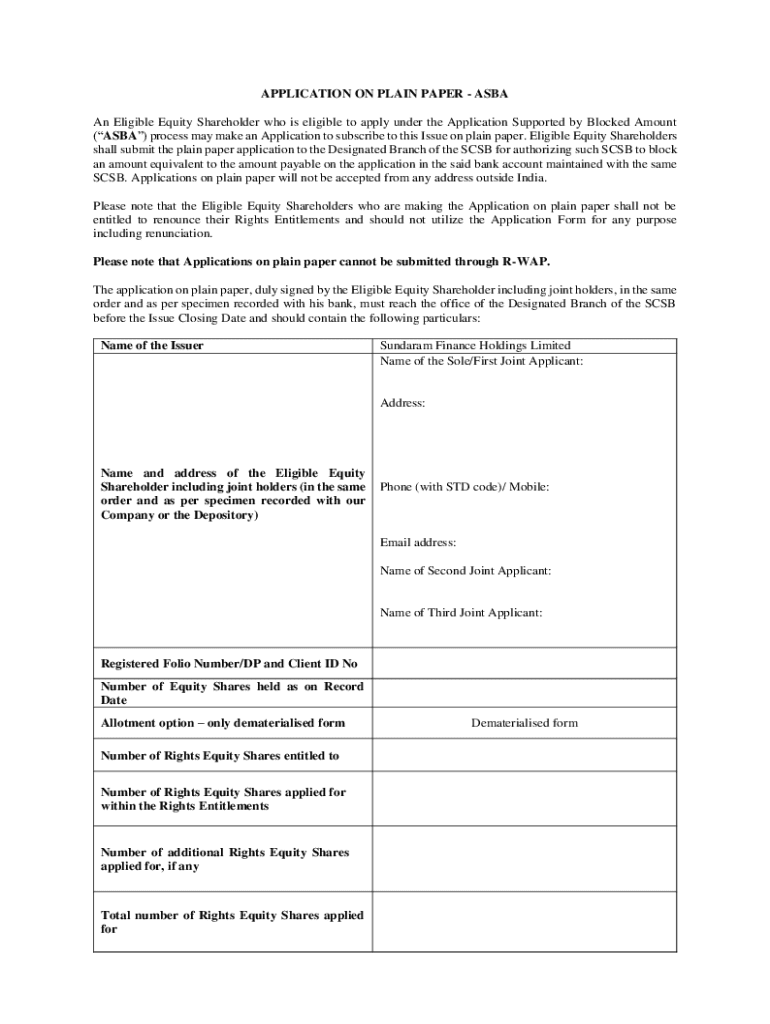 The ASBA Application Form is an application document used by eligible equity shareholders in India to apply for subscribing to an issue on plain paper.