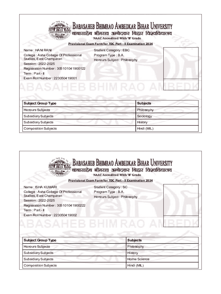 Completion of the provisional exam form is necessary for all students intending to take the TDC Part - II Examination 2024. This includes individuals enrolled in specific academic programs at Asha College, such as: