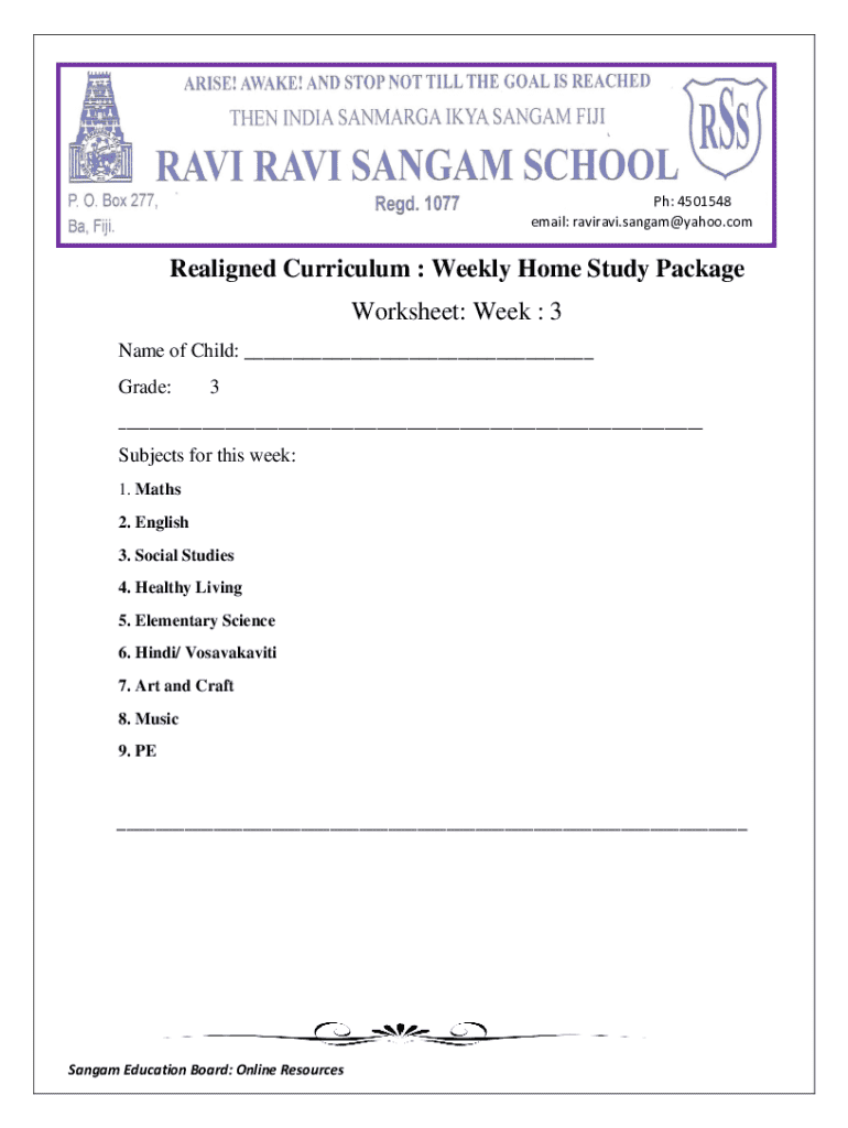The Weekly Home Study Package is a structured educational tool designed specifically for grade 3 students, helping them complete weekly assignments across various subjects. This package is linked to the education curriculum set forth by the Sangam Education Board, aligning with the Realigned Curriculum standards. It encompasses multiple subjects, including Maths and English, tailored to enhance learning outcomes through targeted exercises and worksheets.