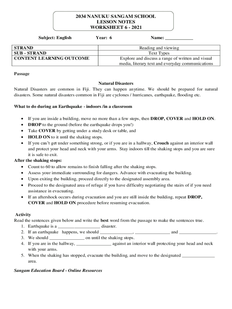 The Fiji School Worksheets is a set of educational documents designed for Year 6 students at Nanuku Sangam School to assist with learning various subjects.