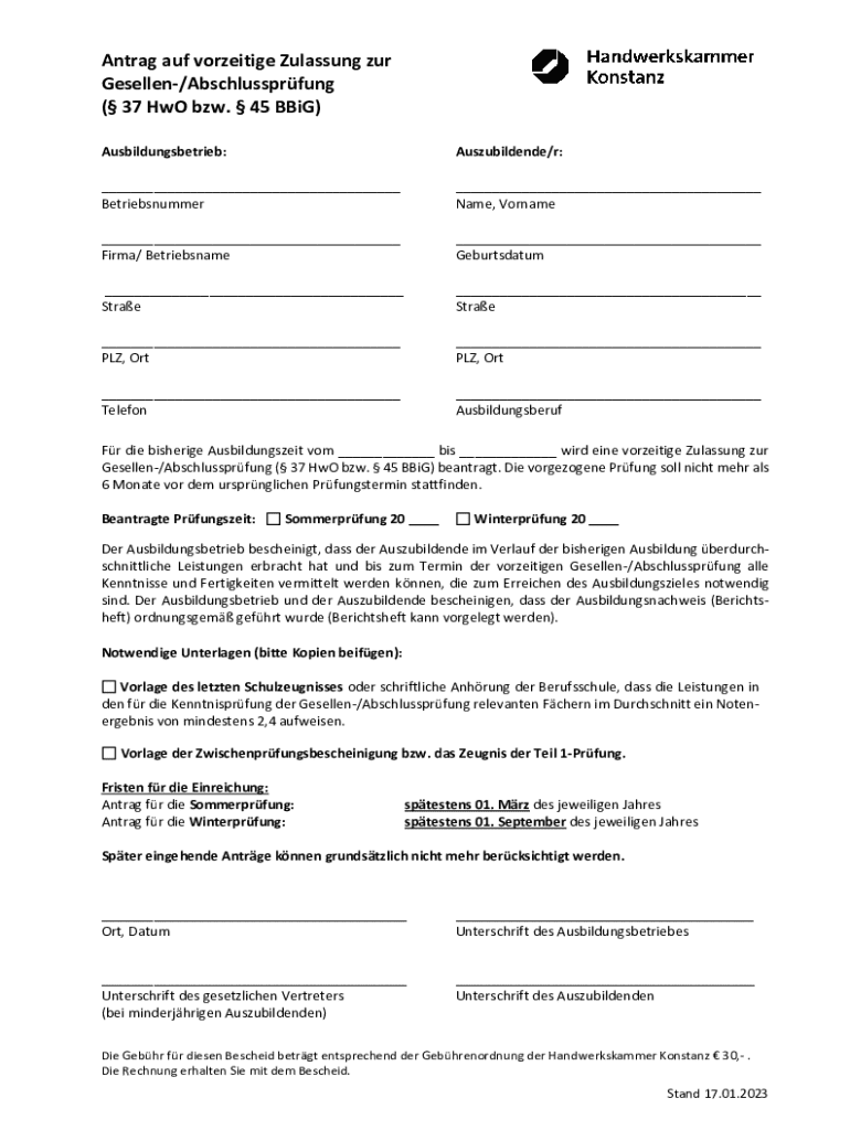 Der Antrag auf vorzeitige Abschlussprüfung der deutschen Ausbildung ist ein wichtiger Schritt für Auszubildende, die eine frühzeitige Zulassung zur Abschlussprüfung beantragen möchten. Er dient dazu, den zuständigen Stellen die nötigen Informationen bereitzustellen, um die Anfrage zu bearbeiten. Das korrekte Ausfüllen des Formulars ist entscheidend für den Erfolg des Antrags.