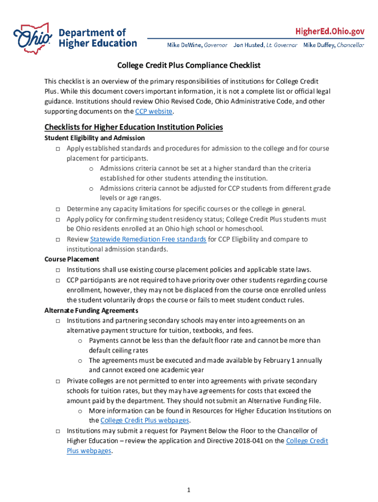 This compliance checklist is vital for all higher education institutions in Ohio that participate in the College Credit Plus program. Key stakeholders include: