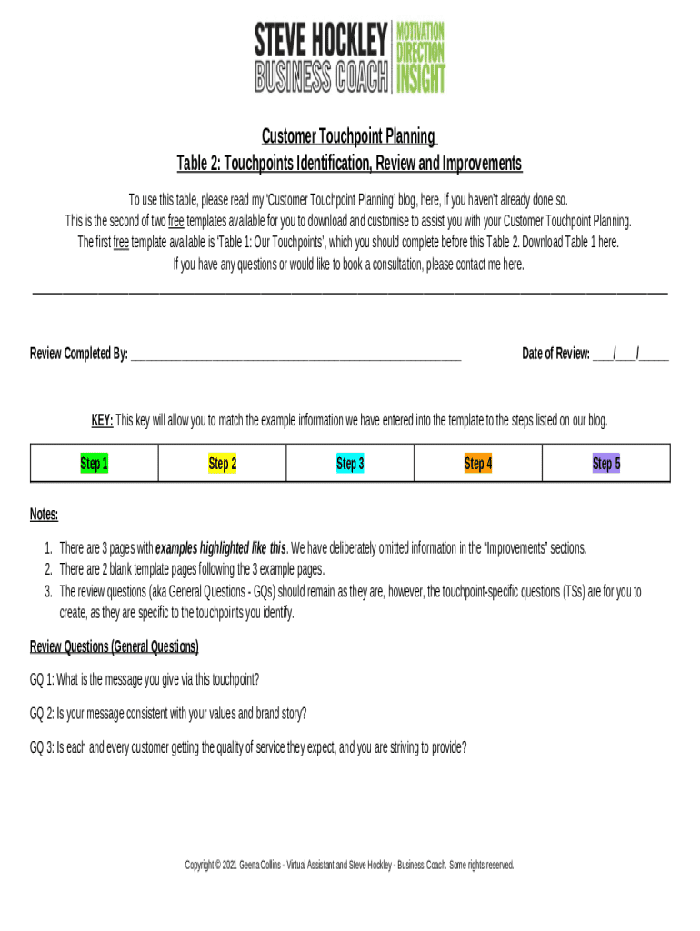 The Customer Touchpoint Planning Table is a business form used by organizations to identify, review, and improve customer touchpoints throughout the buying journey.