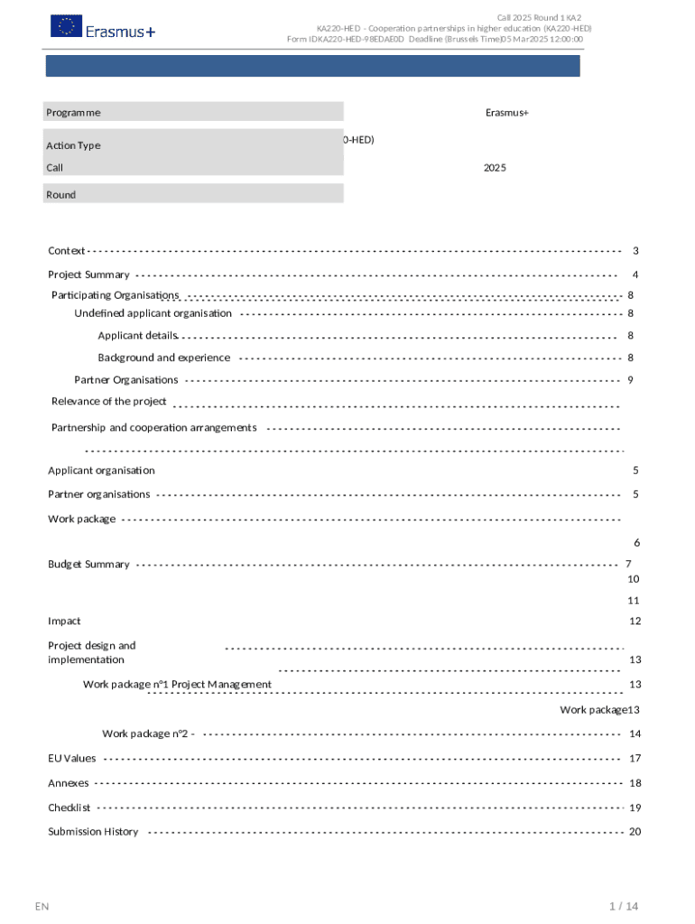 The target audience for the Erasmus+ KA220-HED Application Form includes higher education institutions, project coordinators, and educational organizations looking to develop collaborative projects. Such projects typically focus on fostering international cooperation, innovation, and knowledge exchange among educational entities. The KA220-HED form for 2025 is especially relevant for prospective applicants wishing to engage in these initiatives.