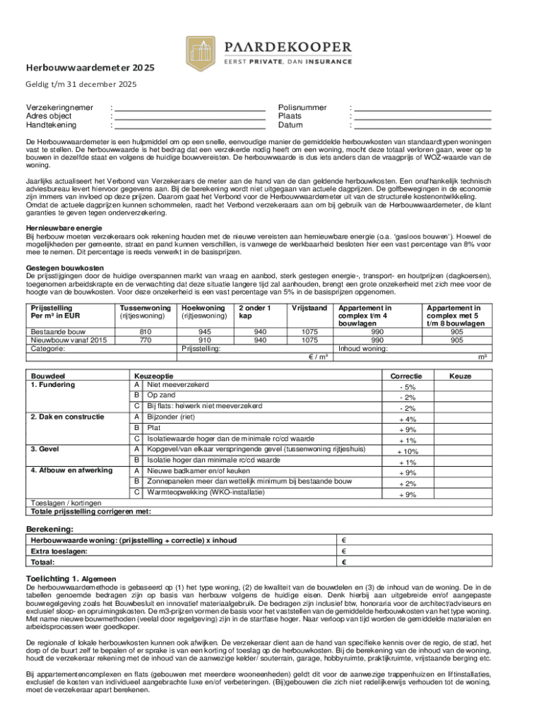 De Herbouwwaardemeter 2025 is een financieel document dat door verzekeraars in Nederland wordt gebruikt om de herbouwwaarde van woningen te berekenen.