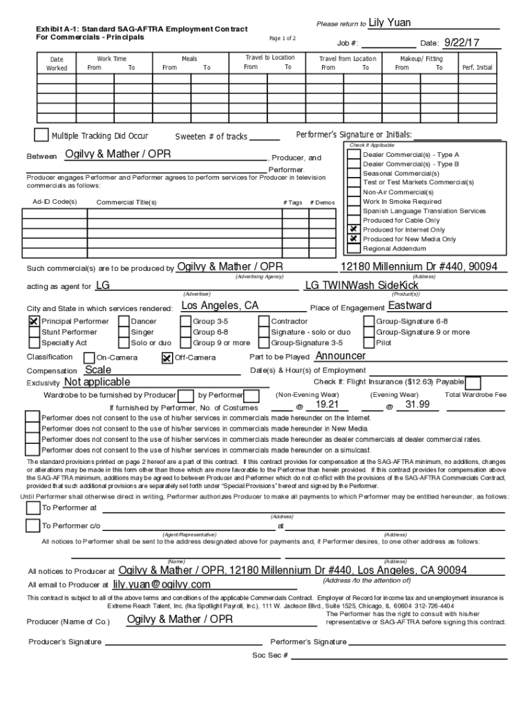 This contract is intended for producers hiring performers for television commercials and performers who agree to commercial projects in California.