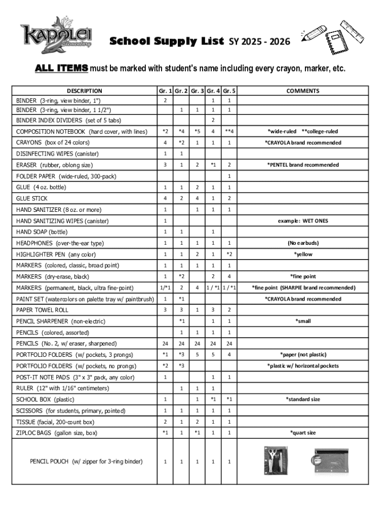 Clearly defined sections for each grade level ensure that all supply needs from grade 1 supply list through grade 5 supply list are addressed.