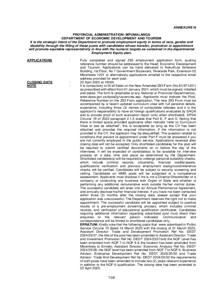 The Z83 Employment Application Form is a crucial document designed for individuals seeking employment within the Mpumalanga Provincial Administration. This form facilitates the application process for various roles, including positions related to economic development and tourism.