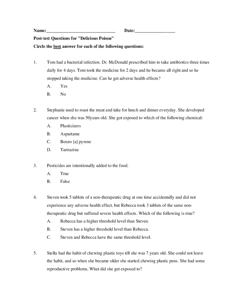 The Delicious Poison Post-test Questions are essential for various users. Students who have completed the associated educational material are the direct recipients of this assessment tool.