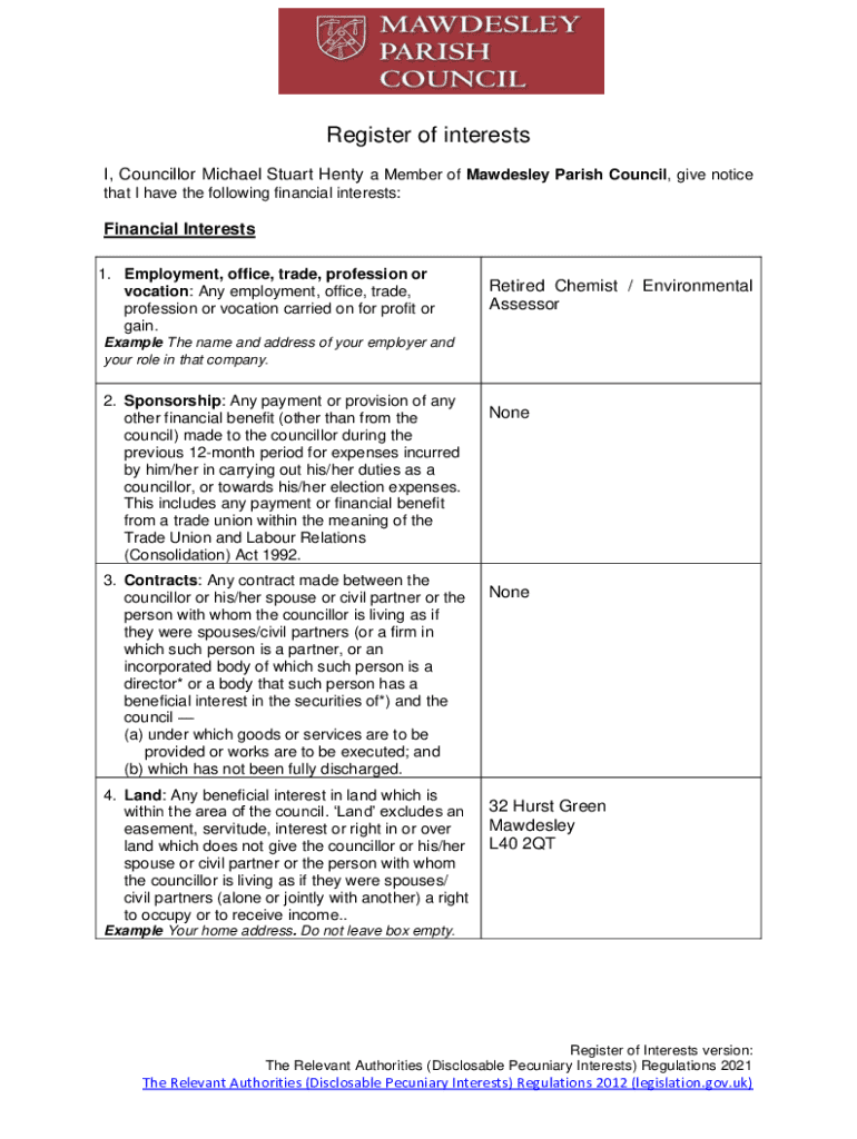 The UK Councillor Register of Interests Form is a government document used by councillors of Mawdesley Parish Council to disclose their financial and other relevant interests.