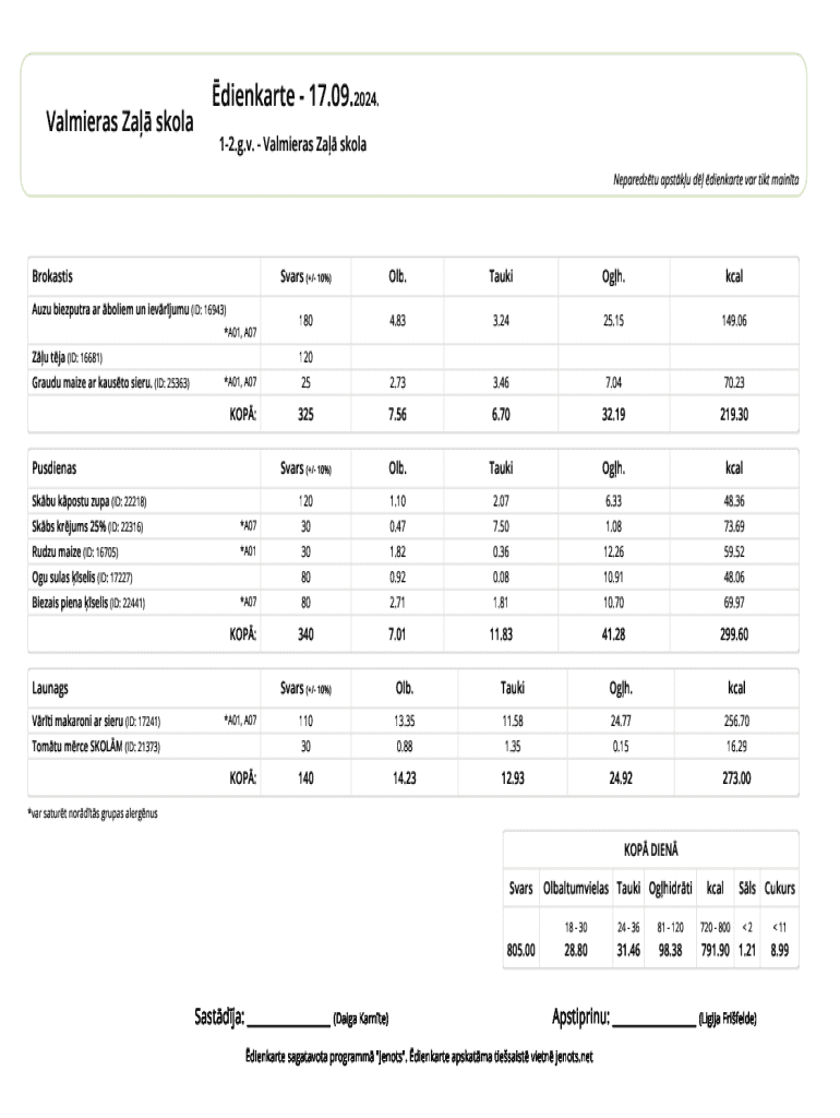 The School Meal Plan Template is a crucial document used in Latvian educational settings to outline daily meals for students, which includes breakfast, lunch, and snacks. This template ensures that required information is clearly defined, encompassing food items, nutritional details, and allergens. A significant aspect of this template is the necessity for signatures from both a teacher and a nutritionist, which validates the meal plan.