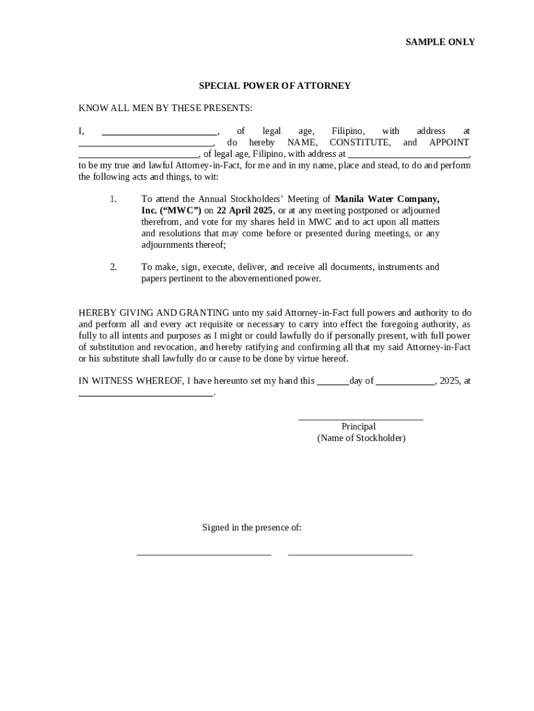 This form is particularly relevant for stockholders of the Manila Water Company. Scenarios that necessitate the use of a Special Power of Attorney may include: