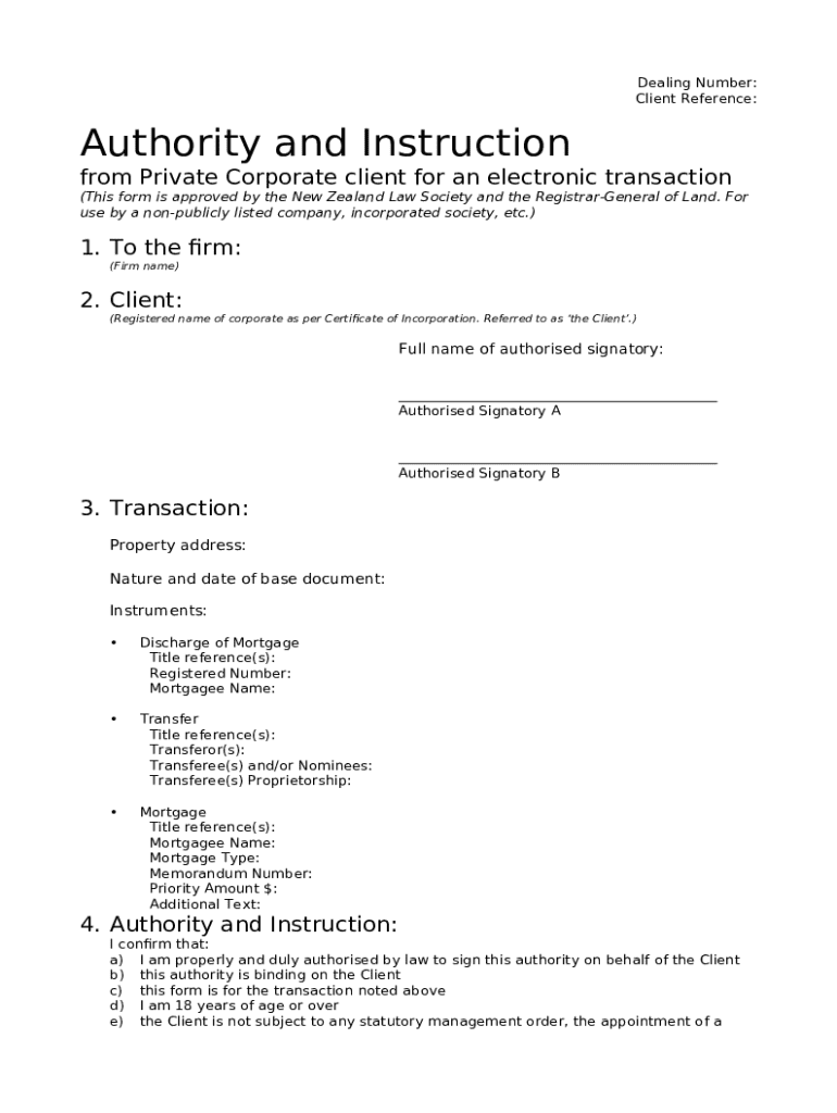 The New Zealand E-Dealing Authority and Instruction Form is a legal document used by property owners to authorize electronic transactions involving properties, such as mortgages and transfers.
