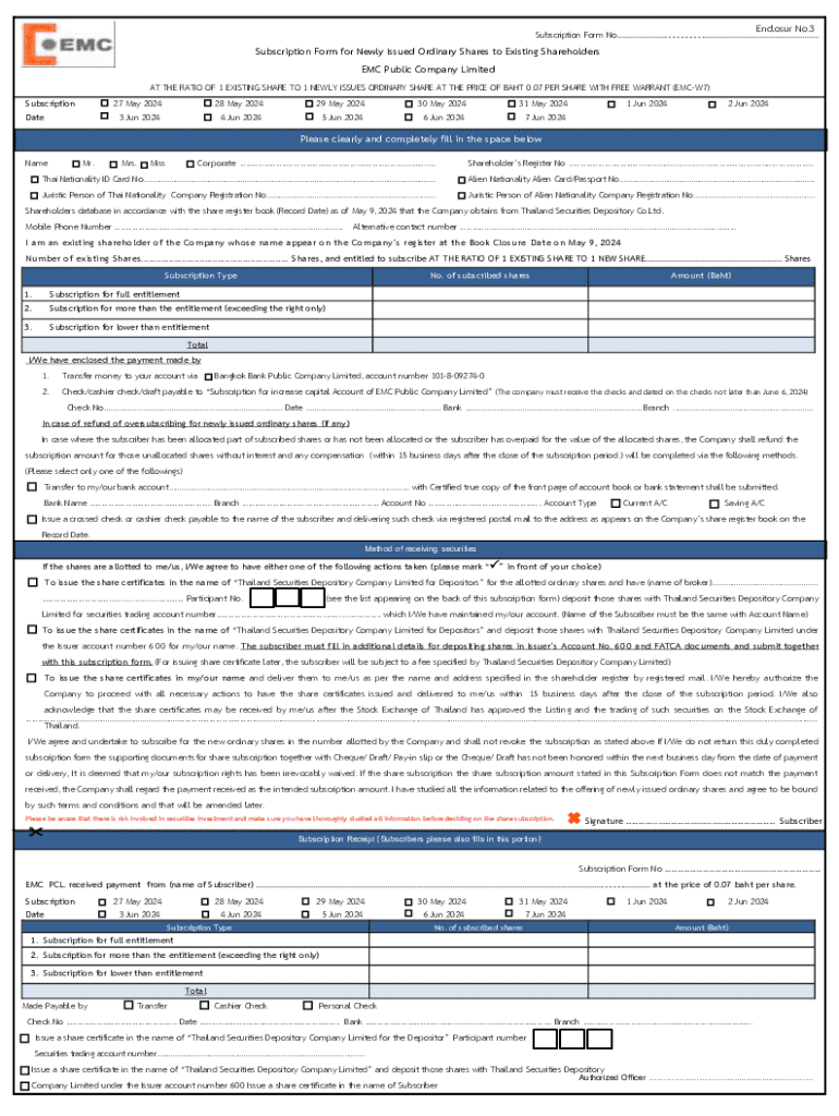 The EMC Subscription Form is a vital document used by shareholders of EMC Public Company Limited to subscribe for new shares. This form is essential for those wishing to participate in the offering of new shares, allowing existing shareholders to maintain their ownership stake in the company. By filling out this form, individuals can directly facilitate their share acquisition, ensuring their investments are kept intact.