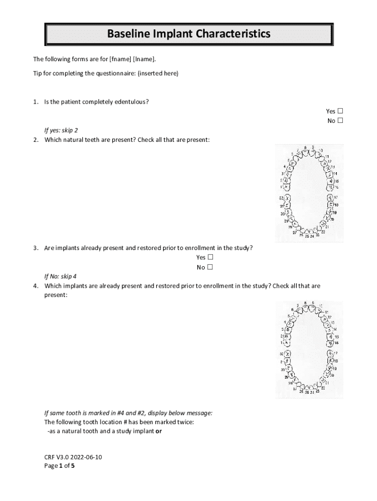 Baseline Implant Characteristics The following forms are for [fname] [lname]. Tip for completing the questionnaire: (inserted here)1. Is the patient completely edentulous?If yes: skip 2 2. Which natural