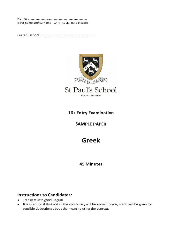 Get the free 16+ Entry Examination Greek Sample Paper