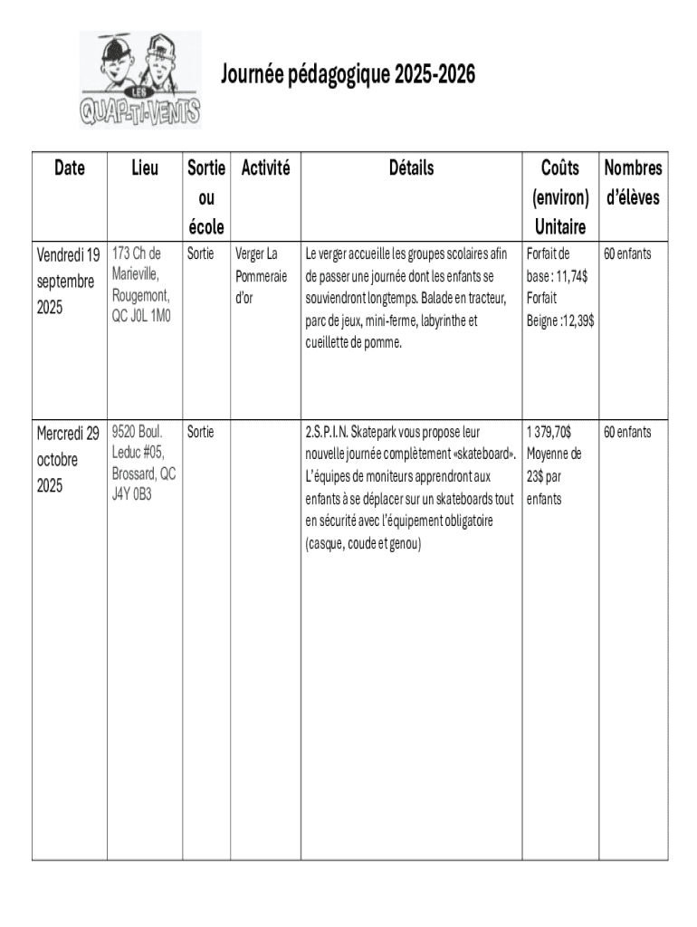 Journe pdagogique 20252026 DateLieuSortie ou coleActivitDtailsCots (environ) UnitaireNombres dlvesVendredi 19 septembre 2025173 Ch de Marieville, Rougemont, QC J0L 1M0SortieVerger La Pommeraie dorLe