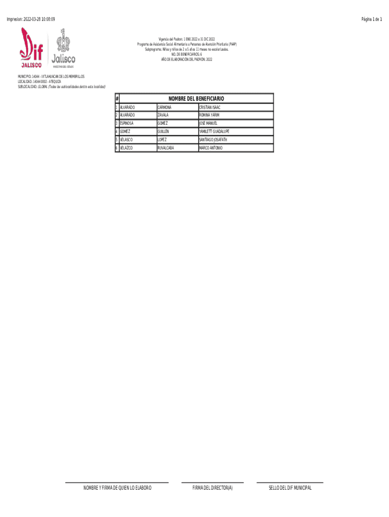 3.Reúnase con la información necesaria: nombres de beneficiarios, municipio y localidad. Asegúrese de tener la firma del director y el sello del DIF municipal.