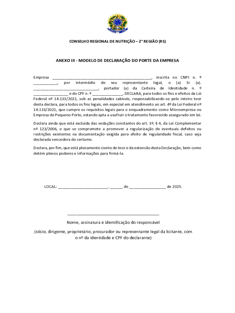 O Formulário de Declaração de Tamanho da Empresa é um documento usado por empresas no Brasil para declarar sua categoria de tamanho como Microempresa ou Pequeno Porte de acordo com a Lei Federal 14.133/2021.