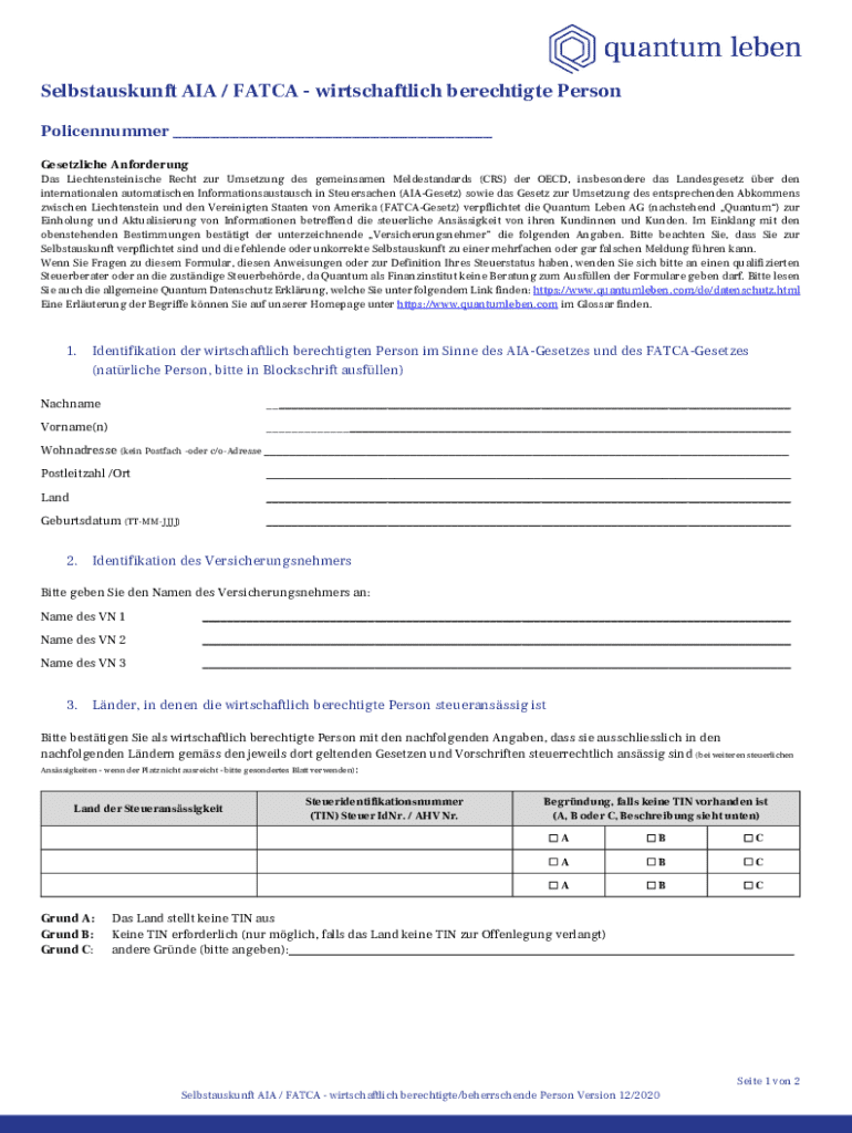 Das AIA FATCA Selbstoffenlegungsformular ist ein Dokument, das von Personen in Liechtenstein verwendet wird, um den OECD-Standards für den automatischen Austausch von Informationen zu entsprechen und Informationen über ihren Steuerwohnsitz und ihren wirtschaftlichen Status offenzulegen.