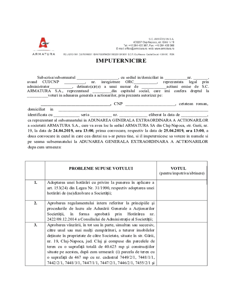 IMPUTERNICIRE Subscrisa/subsemnatul ___, cu sediul in/domiciliat in ___nr. ___, avand CUI/CNP ___, nr. inregistrare ORC___, reprezentata legal prin administrator___, detinato(a)r(e) a unui numar de