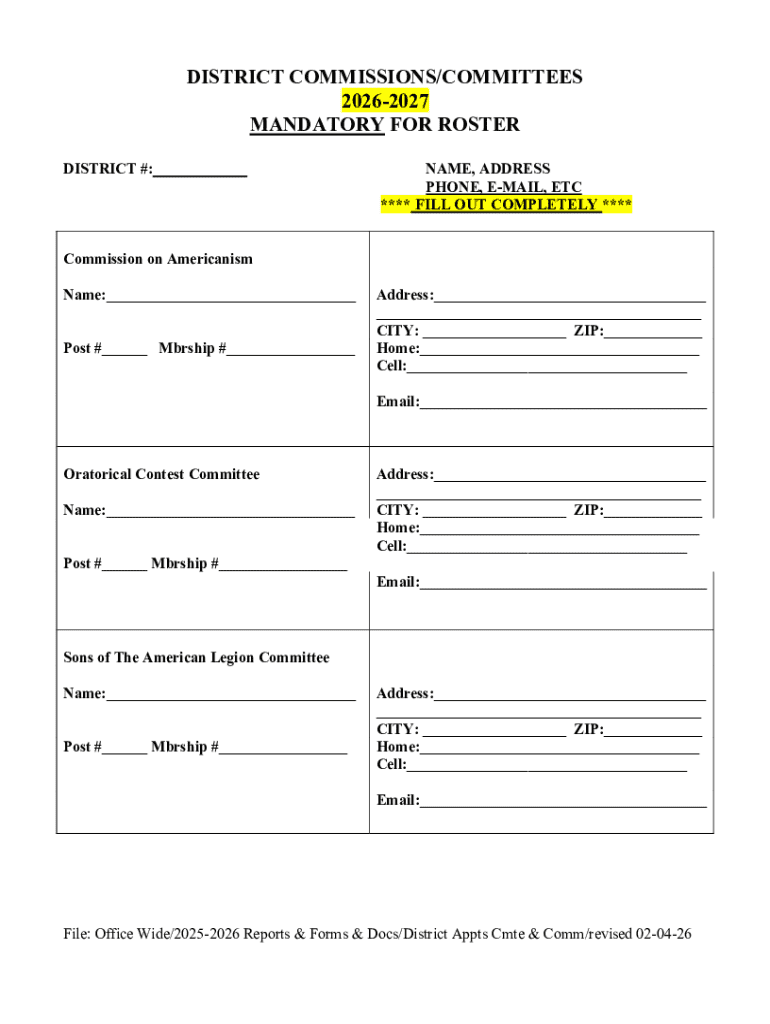 DISTRICT COMMISSIONS/COMMITTEES 20262027 MANDATORY FOR ROSTER DISTRICT #: ___NAME, ADDRESS PHONE, EMAIL, ETC **** FILL OUT COMPLETELY ****Commission on Americanism Name:___ Post #___ Mbrship #___Address:___