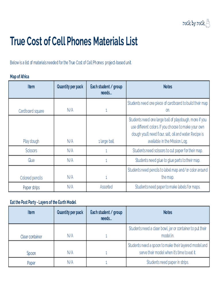 The materials list, specifically designed for educators engaged in project-based learning, serves as a critical resource for organizing supplies needed for various educational activities. This document directly supports the "True Cost of Cell Phones" educational project, helping teachers gather and manage classroom supplies efficiently during interactive lessons.