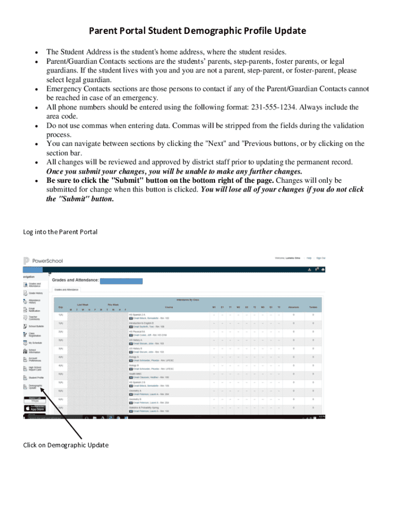 Parent Portal Student Demographic Profile UpdateThe Student Address is the student\'s home address, where the student resides. Parent/Guardian Contacts sections are the students parents, stepparents,