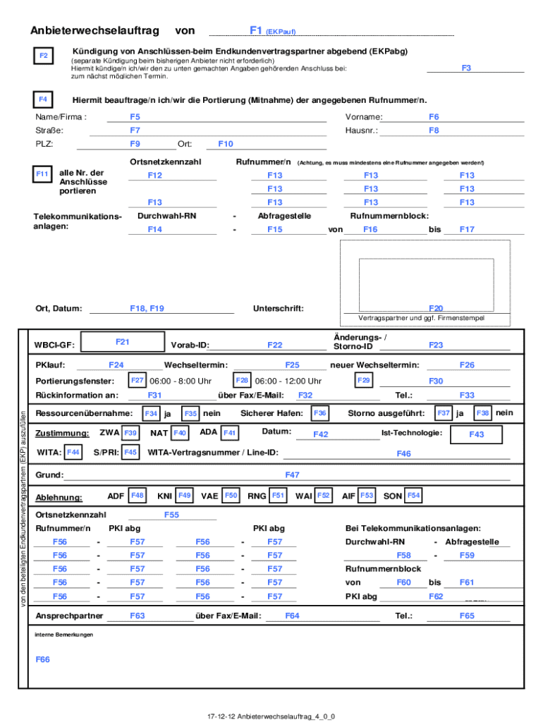 Das Anbieterwechselauftrag Form ist ein Dokument, das von Kunden in Deutschland verwendet wird, um die Kündigung von Verbindungen bei ihrem aktuellen Dienstanbieter und die Mitnahme von Telefonnummern zu einem neuen Anbieter zu beantragen.