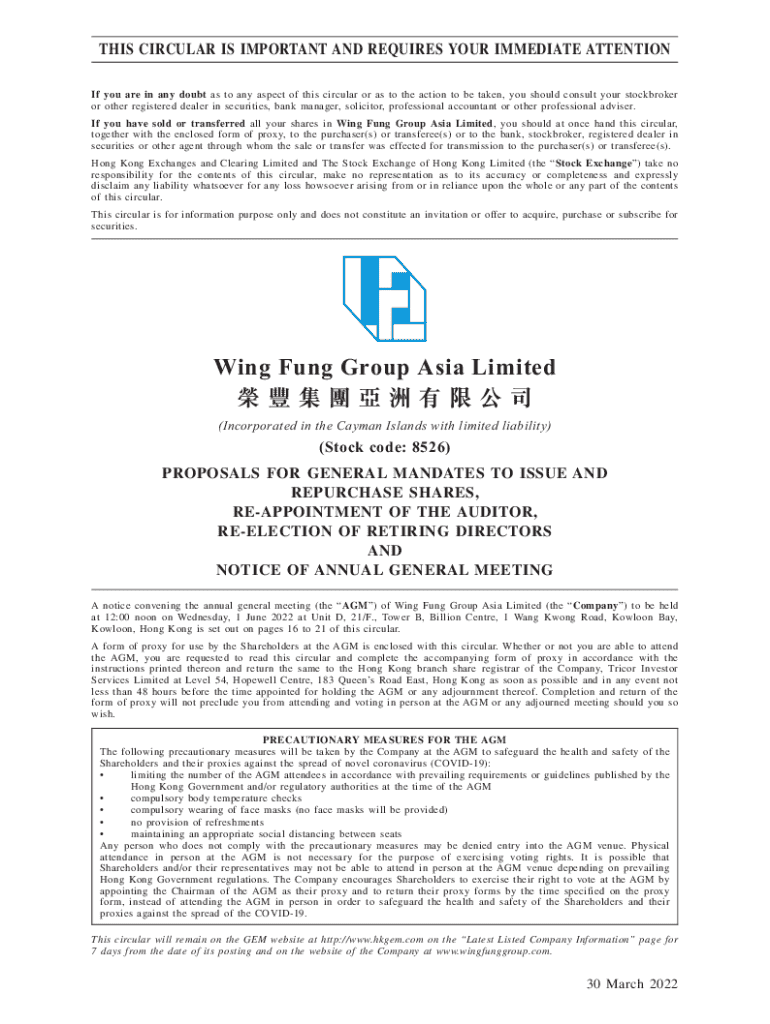 The Wing Fung Group Asia Annual General Meeting Proxy Form serves as a crucial tool for shareholders, allowing them to appoint a proxy to vote on their behalf at the company's annual general meeting. This proxy form is essential for ensuring that all shareholder voices are heard, particularly for those unable to attend the meeting in person. Shareholders must recognize the importance of the proxy form in exercising their voting rights.