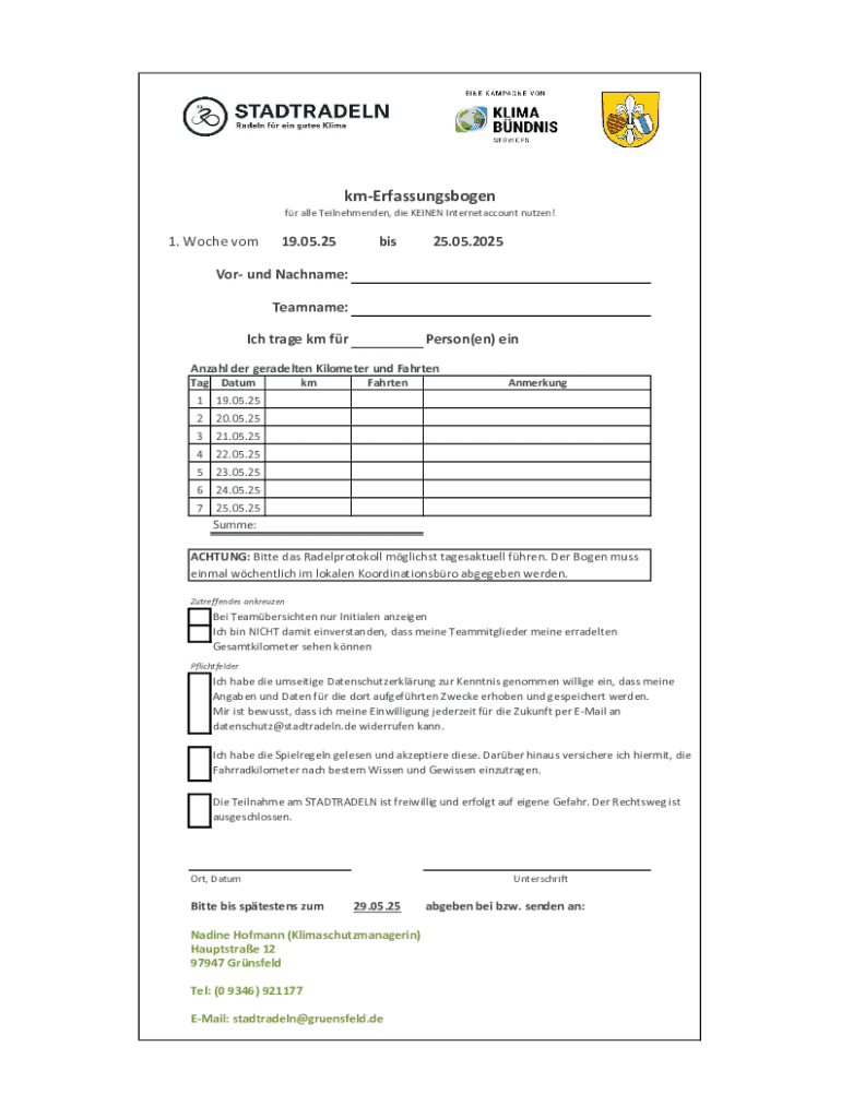 kmErfassungsbogen fr alle Teilnehmenden, die KEINEN Internetaccount nutzen!1. Woche vom19.05.25bis25.05.2025Vor und Nachname: Teamname: Ich trage km frPerson(en) einAnzahl der geradelten Kilometer