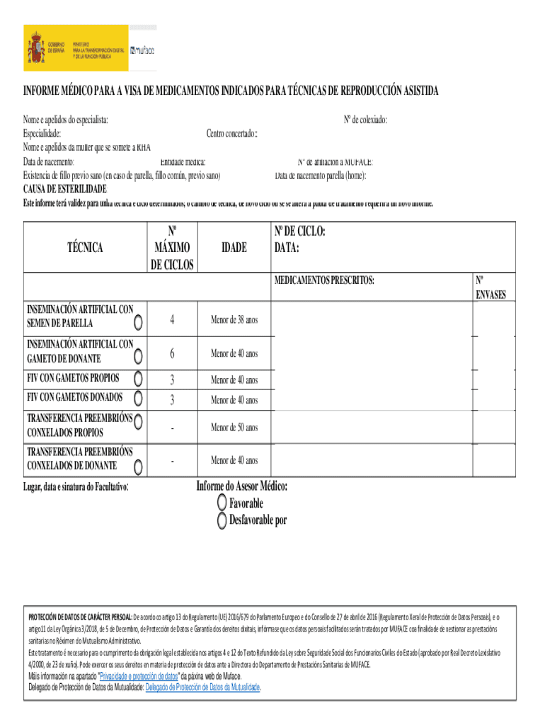 GARDARPARA IMPRIMIRBORRARINFORME MDICO PARA A VISA DE MEDICAMENTOS INDICADOS PARA TCNICAS DE REPRODUCCIN ASISTIDA Nome e apelidos do especialista: Especialidade: Centro concertado:: Nome e apelidos