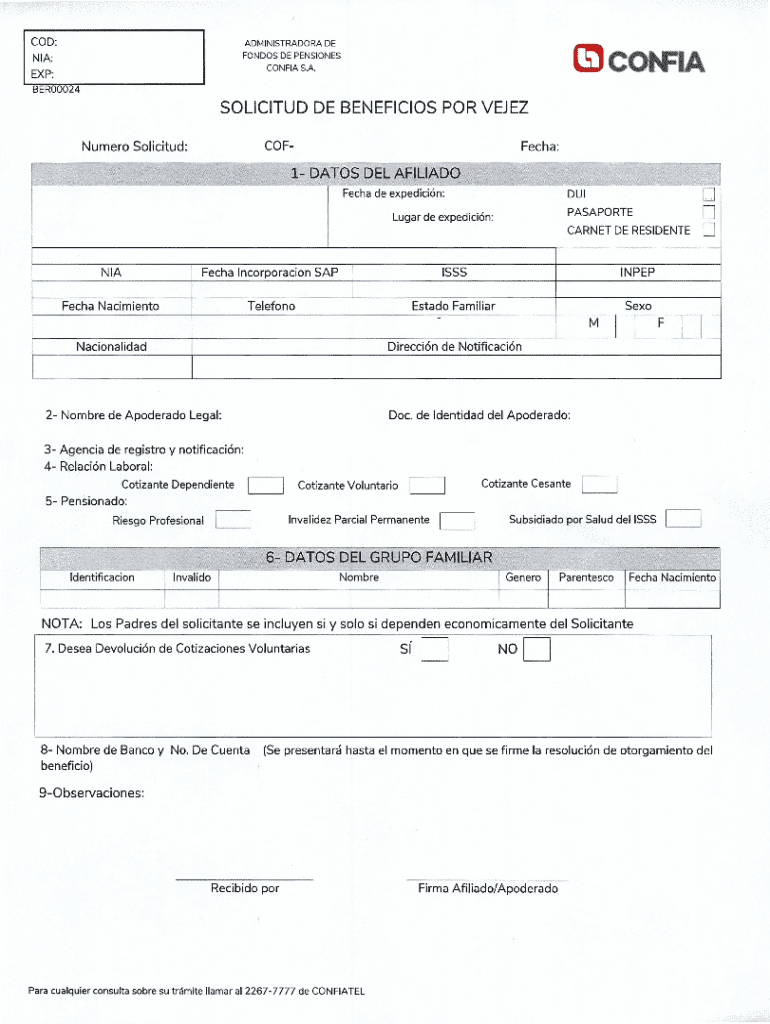 COD:ADMINISTRADORA DE FONDOS DE PENSIONES CONFIA S.A.NIA: EXP:0 COIF1ABER00024SOLICITUD DE BEN EFICIOS POR VEJEZ COFNumero Solicitud:Fecha:1 DATOS DEL AFILIADO Fecha de expedicin:DUI PASAPORTELugar