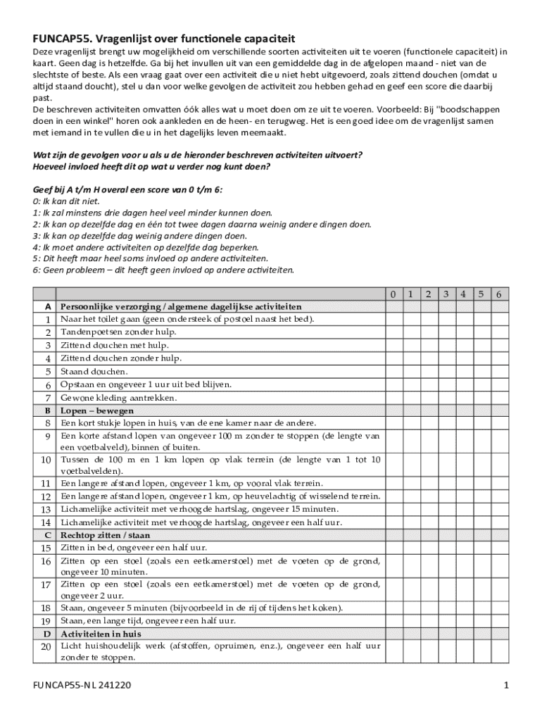 Gebruik pdfFiller om je FUNCAP55 Functionele Capaciteitsvragenlijst eenvoudig in te vullen