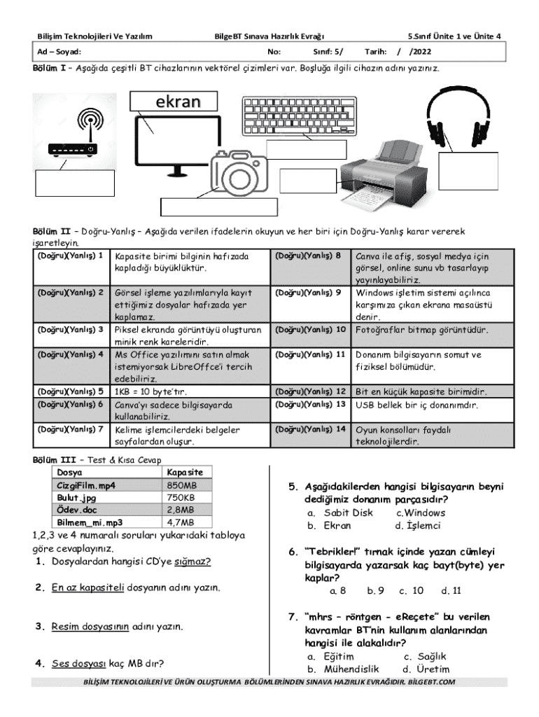 The BilgeBT 5th Grade IT Exam Preparation Worksheet is an educational document used by 5th-grade students in Turkey to prepare for IT exams.