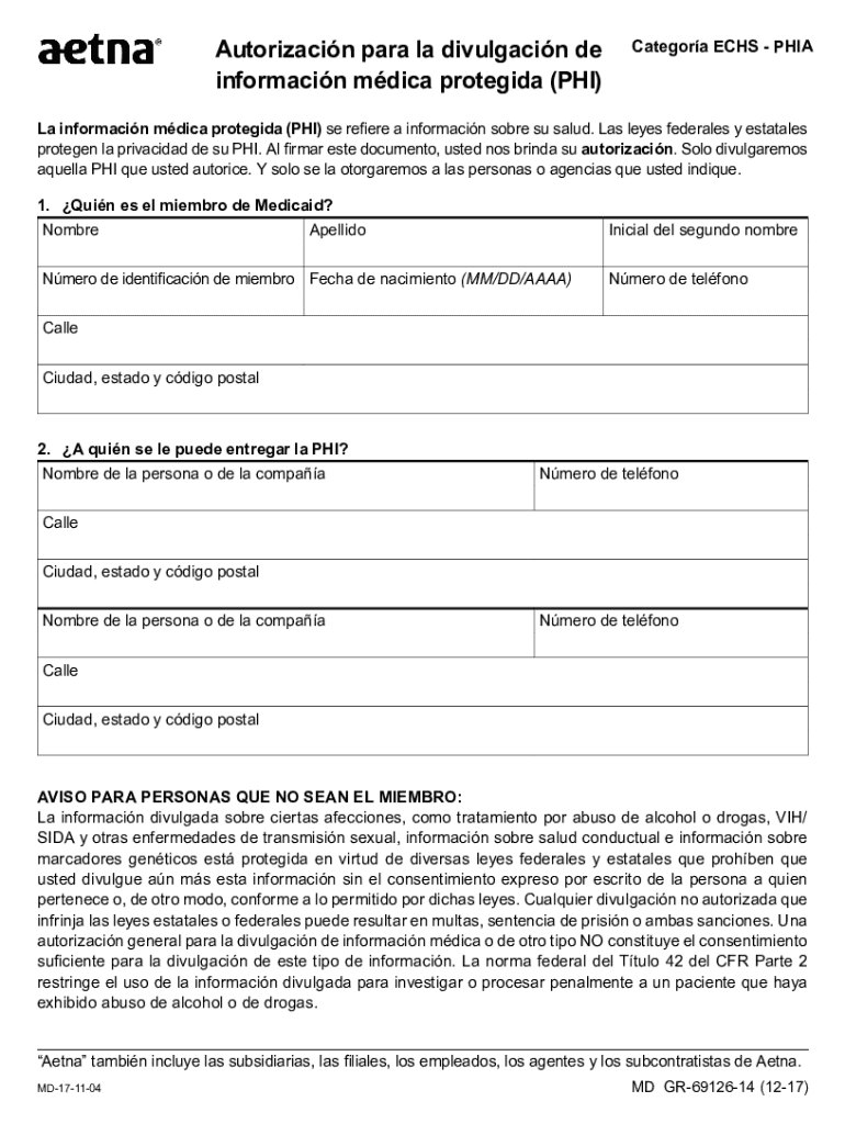 Cualquier miembro de Aetna o su representante autorizado puede utilizar el Aetna PHI Authorization Form para autorizar la divulgación de su información médica.