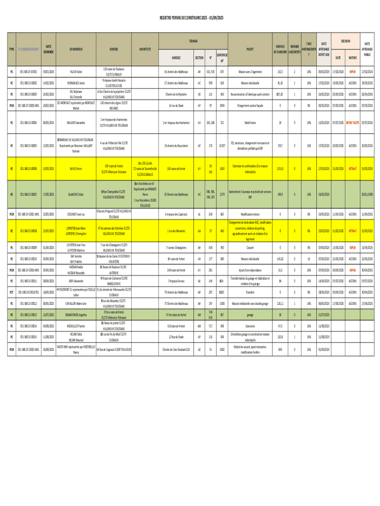 REGISTRE PERMIS DE CONSTRUIRE 202501/09/2025TERRAIN TYPEN ENREGISTREMENTDATE DEMANDEDEMANDEURPC031 588 25 0 000130/01/2025YALCIN SahinPC031 588 25 0000214/02/2025HERNANDEZ Annie GIL Stphane GIL Christelle