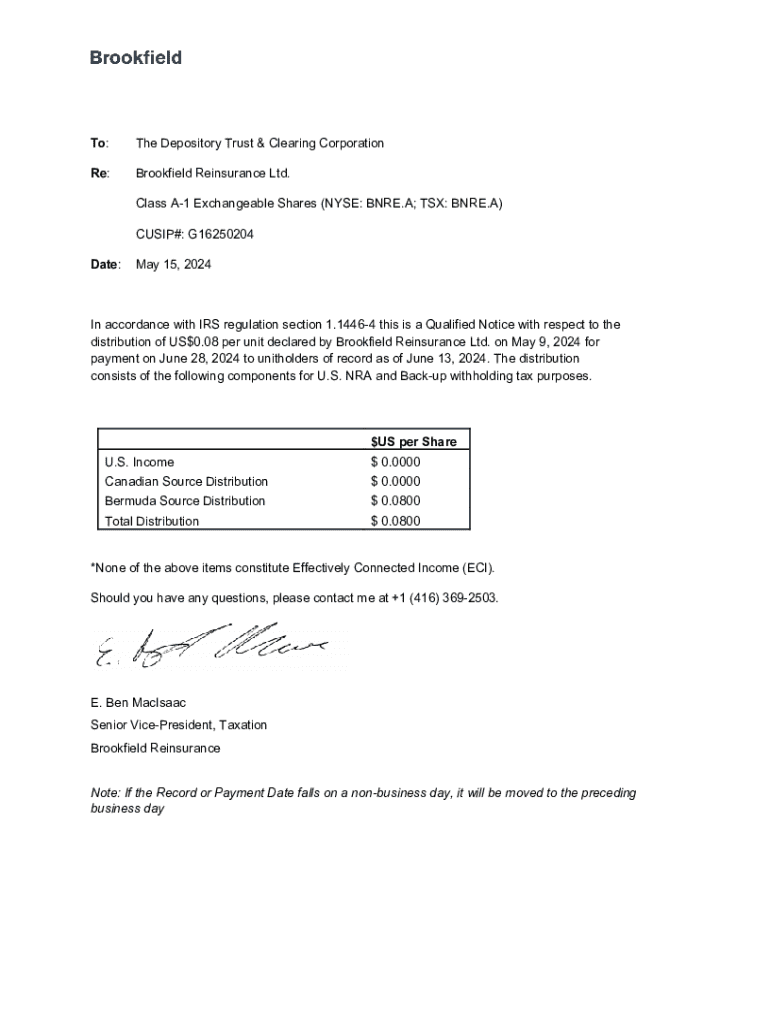 On May 9, 2024, Brookfield Reinsurance Ltd. announced a distribution amounting to US$0.08 per unit, intended for payment on June 28, 2024. Understanding this IRS qualified notice helps U.S. NRAs in preparing for tax withholding and complying with applicable laws, as it clearly delineates that none of the items mentioned constitute Effectively Connected Income (ECI).