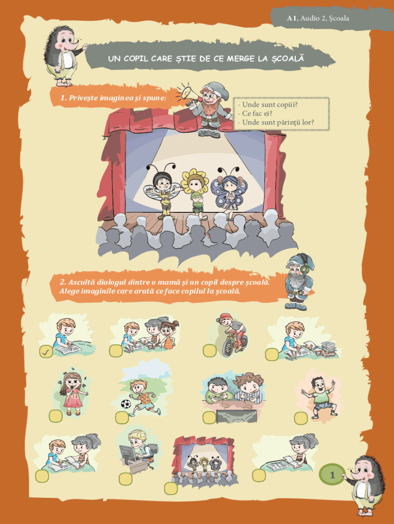 6.Make sure to complete all required sections, like 'Privește imaginea și spune' and 'Ascultă dialogul dintre o mamă și un copil despre școală', ensuring clarity in your descriptions.